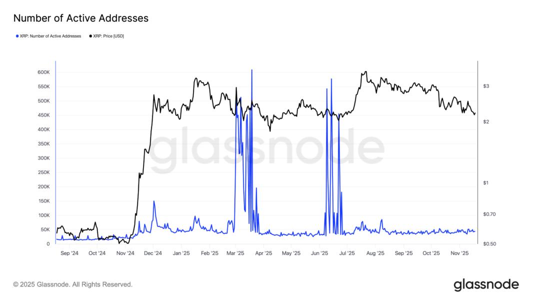 Low daily active addresses signal muted network activity and liquidity, amplifying XRP sell-off risk.