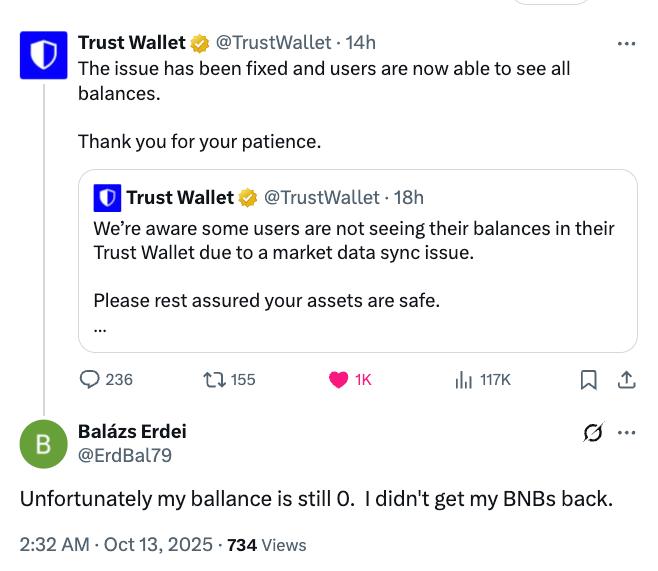 Some users continued to experience the issue even after Trust Wallet said it had been resolved, with commentators reporting that wallet balances were still displaying incorrect information.