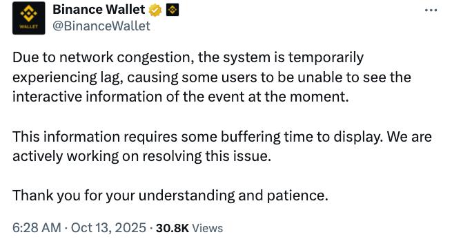Binance Wallet took to X on Monday to report that the wallet was “temporarily experiencing lag” due to network congestion, which caused some users to be unable to view certain wallet data.