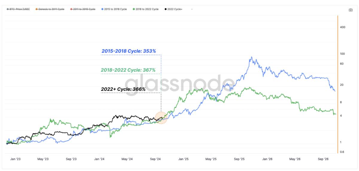 “Both the 2015-16 [blue line], and 2019-20 [green] periods have traded in an oddly similar manner to the recovery seen in 2023-24 [black],” Glassnode analysts said in an Oct. 2 report.
