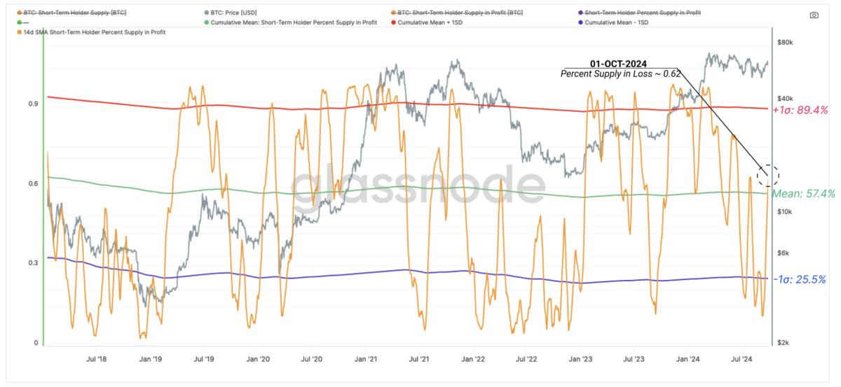 To put this into context, Glassnode analysts examined the percentage of STH supply held in profit and found that more than 62% of their supply is now held in a profitable position, providing relief for buyers who recently acquired their coins.