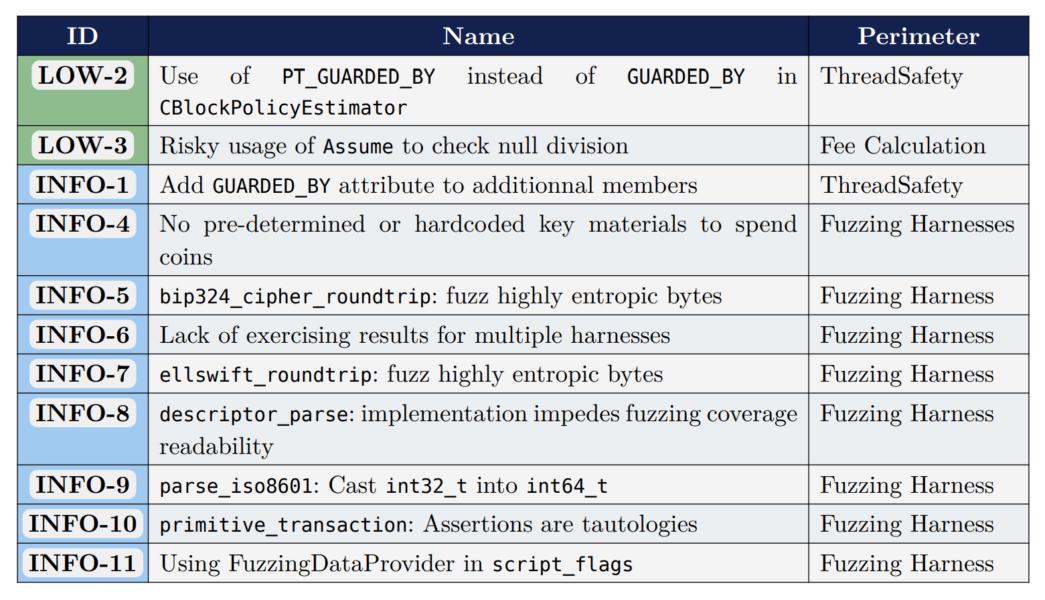 The team found no high- or medium-severity vulnerabilities, identifying only two low-severity issues and a series of improvement suggestions related mostly to fuzzing harnesses and test coverage. None of the findings had any impact on consensus, denial-of-service resilience or transaction validation.