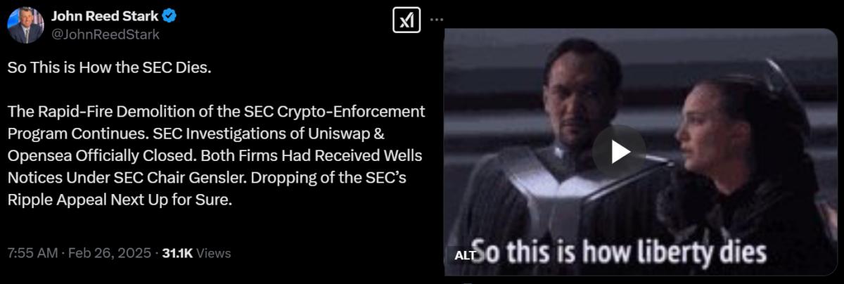 John Reed Stark, the former Chief of the SEC’s Office of Internet Enforcement, has previously accused the cryptocurrency industry of spreading myths to mask its lack of transparency and accountability, commented on the “demolition of the SEC Crypto-Enforcement Program” on X. Using a meme, Stark expressed frustration over recent developments.