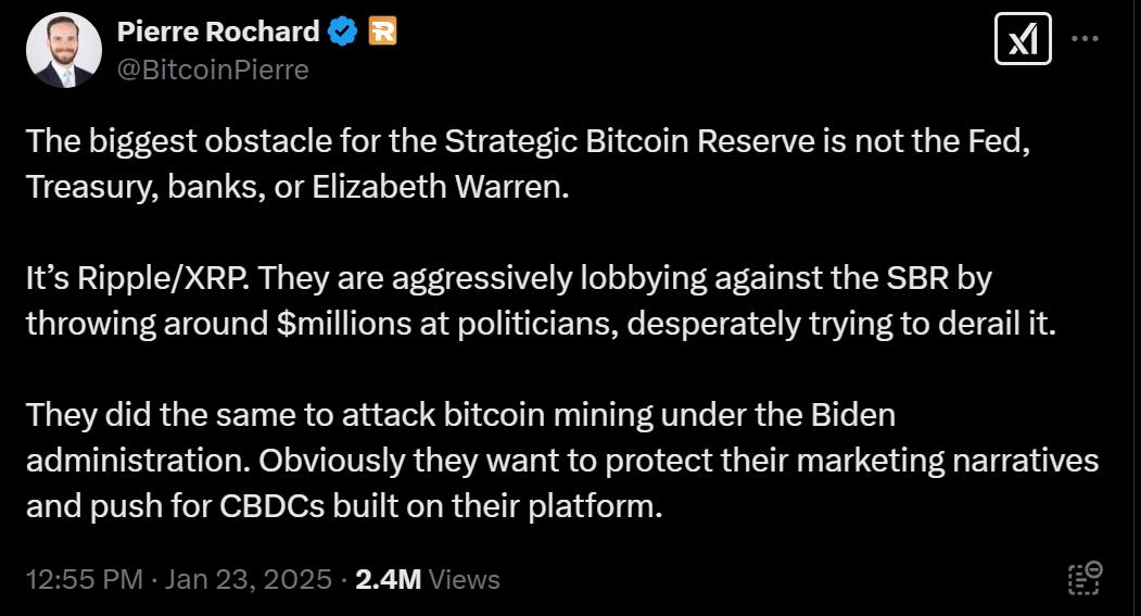 Another source of concern for XRP holders is the reportedly failed attempt by Ripple CEO Brad Garlinghouse to persuade the US government to adopt a Strategic Digital Asset Reserve instead of focusing solely on Bitcoin. Pierre Rochard, vice president of Research at Riot Platforms, highlighted this setback, noting that Trump’s administration has signaled it will no longer form a crypto council, further downplaying the urgency of such initiatives.
