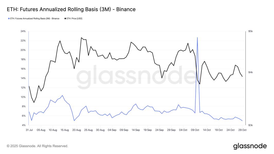 Ether futures are currently trading at a 5% premium relative to standard ETH spot markets, reflecting low demand from buyers using leverage.
