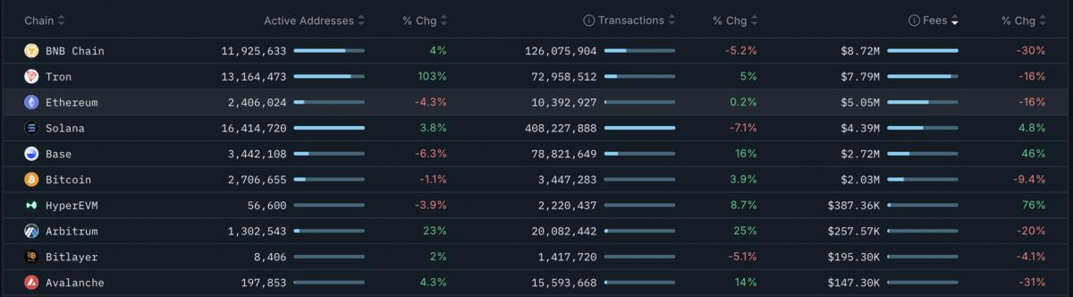 Ethereum chain fees totaled $5 million over the past seven days, representing a 16% decrease from the previous week. By comparison, fees on BNB Chain dropped 30%, and Tron experienced a 16% decline. The number of active addresses on Ethereum’s base layer dropped by 4% over the same period, while Tron saw an over 100% increase.