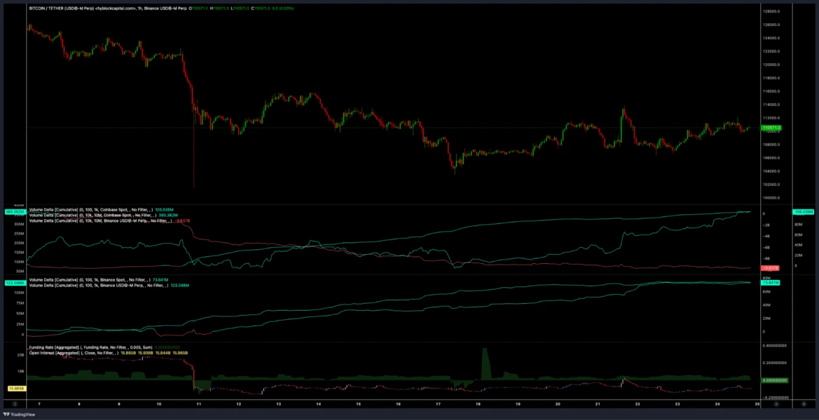 Alongside these inflows, data shows spot buyers across order-size cohorts at Binance and Coinbase exchange stepping in to buy throughout the entire range from $101,500 (Binance) to the range high of this week ($114,000).