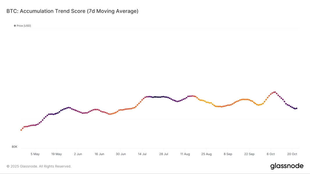 Currently, Glassnode’s Bitcoin Accumulation Trend Score metric also shows a score of 0.924 and the onchain data provider explained that a “trend score closer to 1 indicates that on aggregate, larger entities (or a big part of the network) are accumulating, and a value closer to 0 indicates they are distributing or not accumulating.”