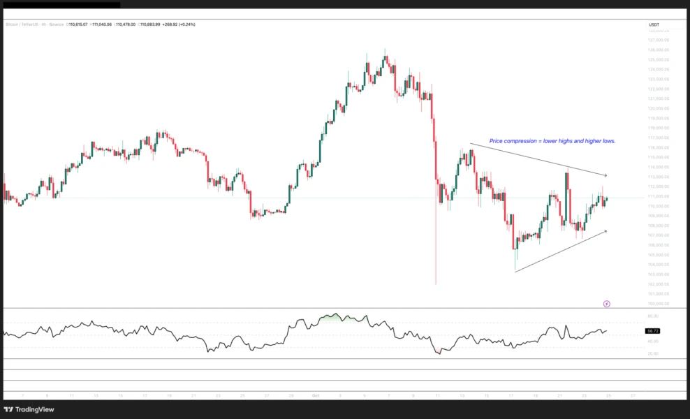 Some analysts have expressed concern at BTC’s inability to hold prices above $112,000 and its frequent revisits to the range lows, but the range compression shown by the four-hour and daily higher lows and lower highs (candlestick chart below) could be a positive sign.