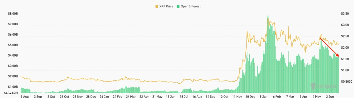 XRP’s inability to reach $3 is reinforced by decreasing open interest (OI), as per data from CoinGlass.