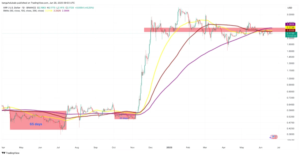 Data from Cointelegraph Markets Pro and TradingView shows that the XRP price is stuck below a key resistance zone between $2.22 and $2.40. This is where all the major simple moving averages (SMAs) currently sit.