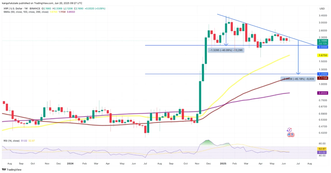 • XRP price is stuck below key trendlines as a classic pattern hints at a drop to $1.20.