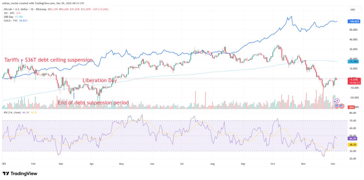 Since the beginning of 2025, gold’s price has risen 58%, outperforming Bitcoin’s 1.5% YTD decline, according to TradingView data.