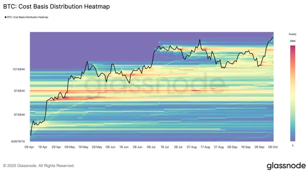Glassnode used a “Cost Basis Distribution Heatmap” to highlight structural support, noting that it was limited between $121,000 and $120,000 and stronger near $117,000, where roughly 190,000 BTC were last acquired.