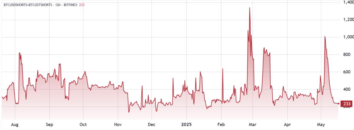 The reasoning behind this move is not entirely clear, since Bitcoin’s jump above $100,000 occurred on May 8, about three weeks after the margin longs peaked. Still, it would be wrong to suggest that Bitfinex whales have adopted a bearish outlook. Their margin longs now total $6.8 billion, while margin shorts stand at just $25 million, showing a major gap between bullish and bearish positions.