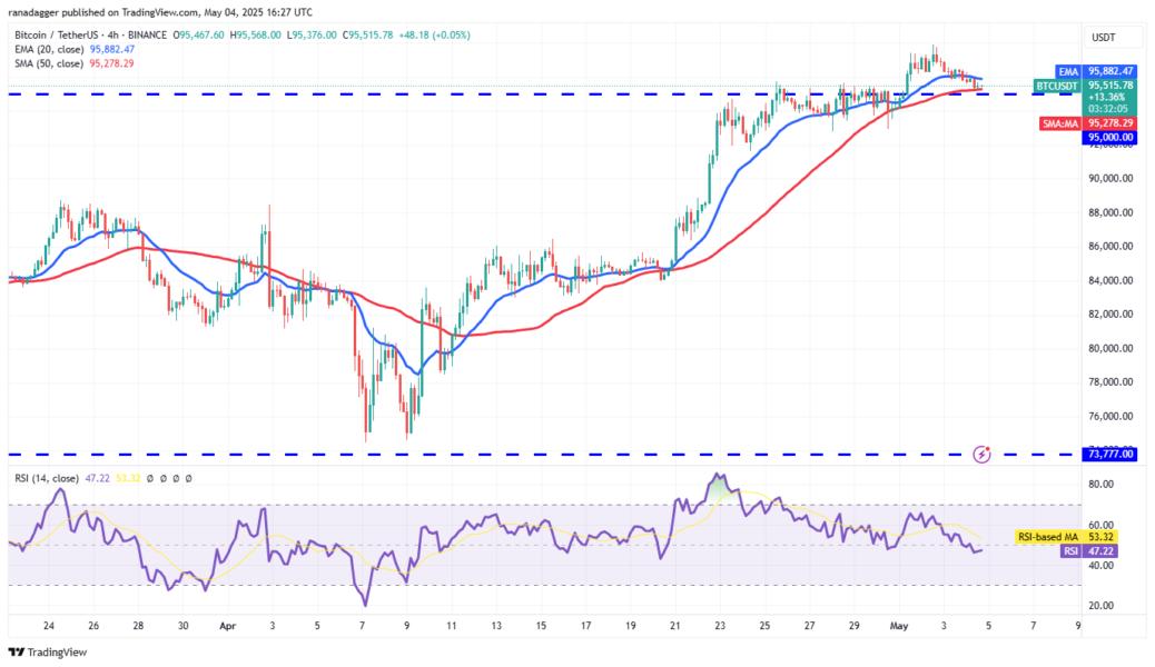 Bitcoin broke above the $95,000 resistance on May 1, but the bulls failed to sustain the momentum. The price turned down from $97,895 on May 2 and has reached the breakout level of $95,000.