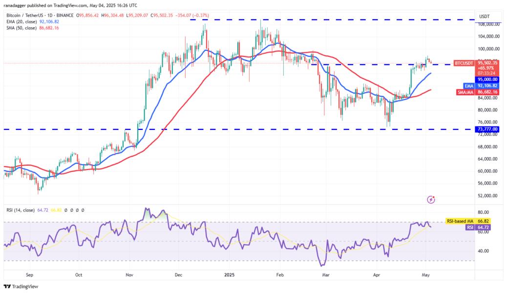 The upsloping 20-day exponential moving average ($92,106) and the relative strength index (RSI) in the positive territory indicate that buyers have the edge. If the price rebounds off the zone between $95,000 and the 20-day EMA, the bulls will make one more attempt to push the BTCUSDT pair to $100,000.
