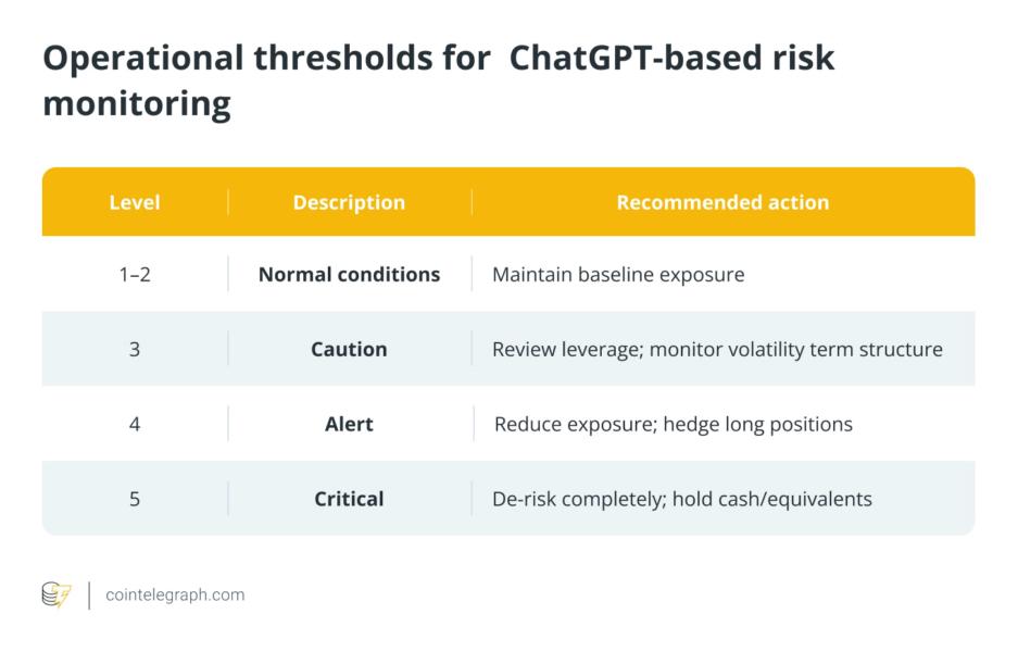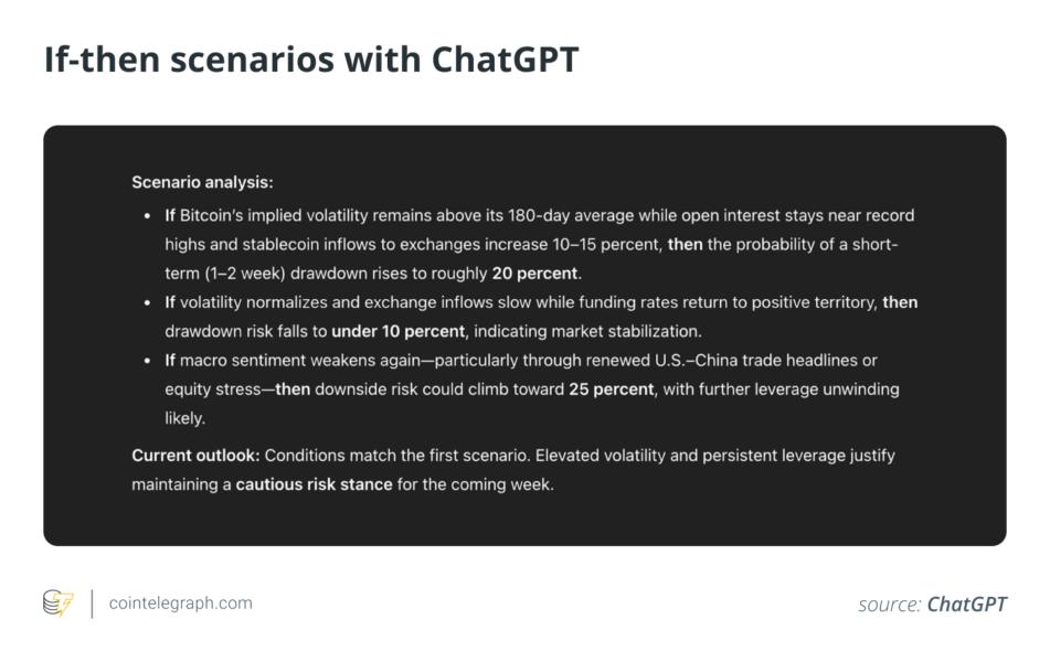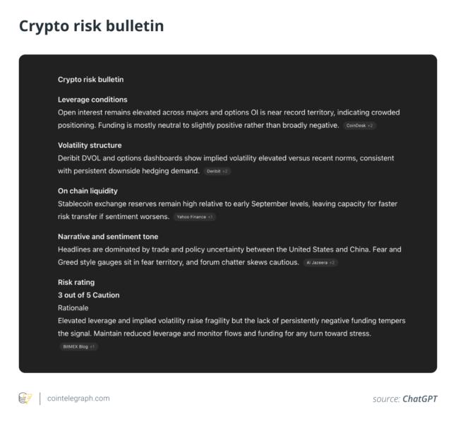 Key takeaways ChatGPT functions best as a risk detection tool, identifying patterns and anomalies that often emerge before sharp market drawdowns. In October 2025, a liquidation cascade followed tariff-related headlines, wiping out billions of dollars in leveraged positions. AI can flag the buildup of risk but cannot time the exact market break. An effective workflow integrates onchain metrics, derivatives data and community sentiment into a unified risk dashboard that updates continuously. ChatGPT can summarize social and financial narratives, but every conclusion must be verified with primary data sources. AI-assisted forecasting enhances awareness yet never replaces human judgment or execution discipline. Language models such as ChatGPT are increasingly being integrated into crypto-industry analytical workflows. Many trading desks, funds and research teams deploy large language models (LLMs) to process large volumes of headlines, summarize onchain metrics and track community sentiment. However, when markets start getting frothy, one recurring question is: Can ChatGPT actually predict the next crash? The October 2025 liquidation wave was a live stress test. Within about 24 hours, more than $19 billion in leveraged positions was wiped out as global markets reacted to a surprise US tariff announcement. Bitcoin  This mix of macro shocks, structural leverage and emotional panic creates the kind of environment where ChatGPT’s analytical strengths become useful. It may not forecast the exact day of a meltdown, but it can assemble early warning signals that are hiding in plain sight — if the workflow is set up properly.BTCUSD plunged from above $126,000 to around $104,000, marking one of its sharpest single-day drops in recent history. Implied volatility in Bitcoin options spiked and has stayed high, while the equity market’s CBOE Volatility Index (VIX), often called Wall Street’s “fear gauge,” has cooled in comparison.