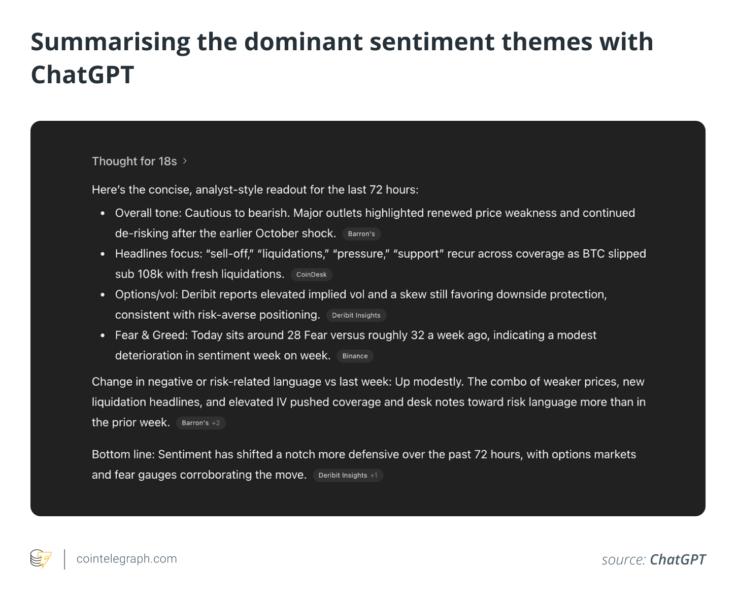 ChatGPT can process thousands of posts and headlines to identify shifts in market narrative. When optimism fades and anxiety-driven terms such as “liquidation,” “margin” or “sell-off” begin to dominate, the model can quantify that change in tone.