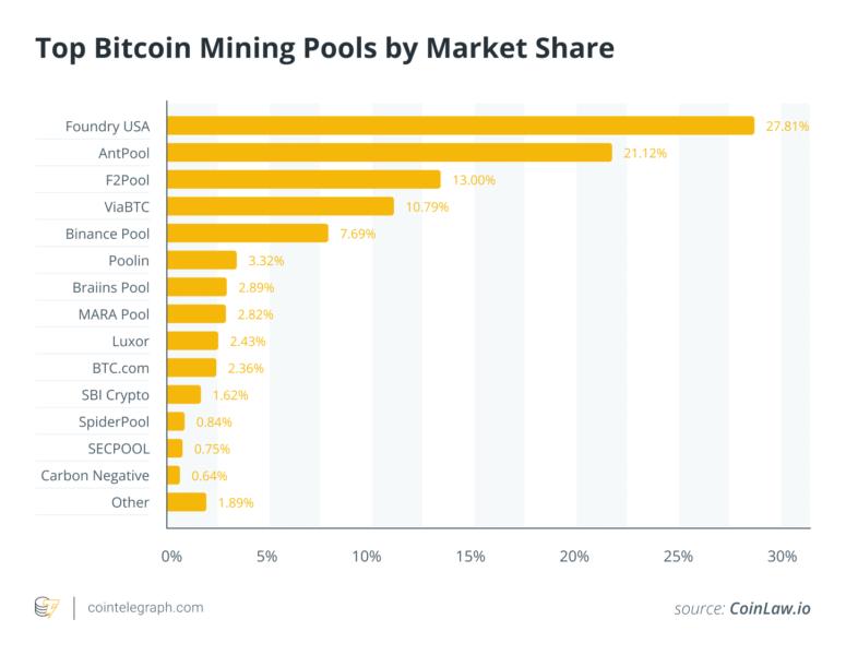 A handful of major pools, such as Foundry USA, AntPool, F2Pool and ViaBTC, dominate the network. Their activity is easy to track on live dashboards that show which pool mined the latest block.