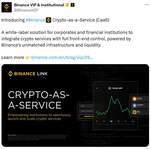 The crypto-as-a-service solution is a “faster path to market without the heavy lift of building everything in-house,” Binance added.