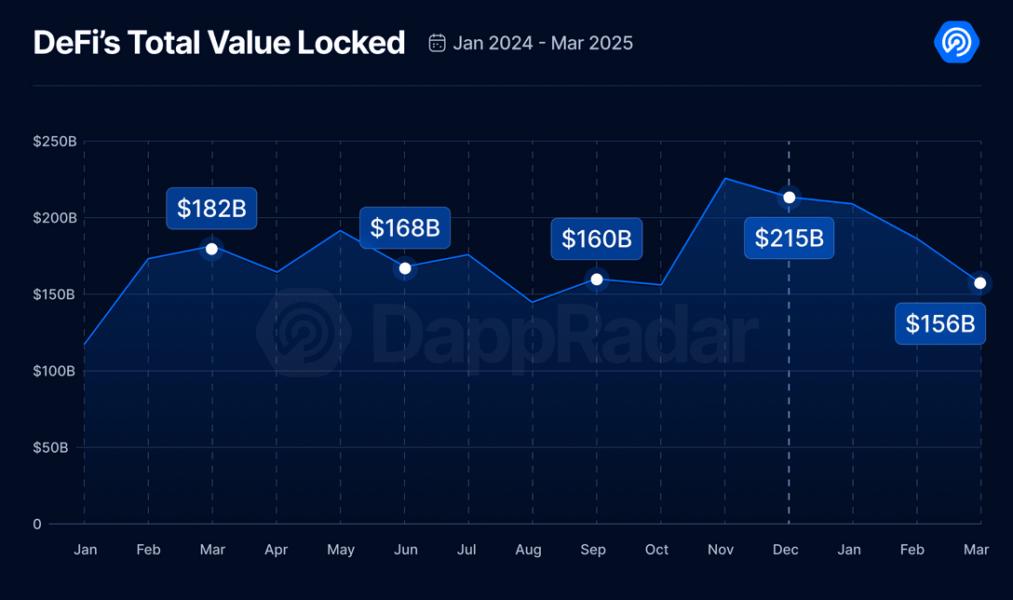 Economic uncertainty and a major crypto exchange hack pushed down the total value locked in decentralized finance (DeFi) protocols to $156 billion in the first quarter of 2025, but AI and social apps gained ground with an increase in network users, according to a crypto analytics firm.
