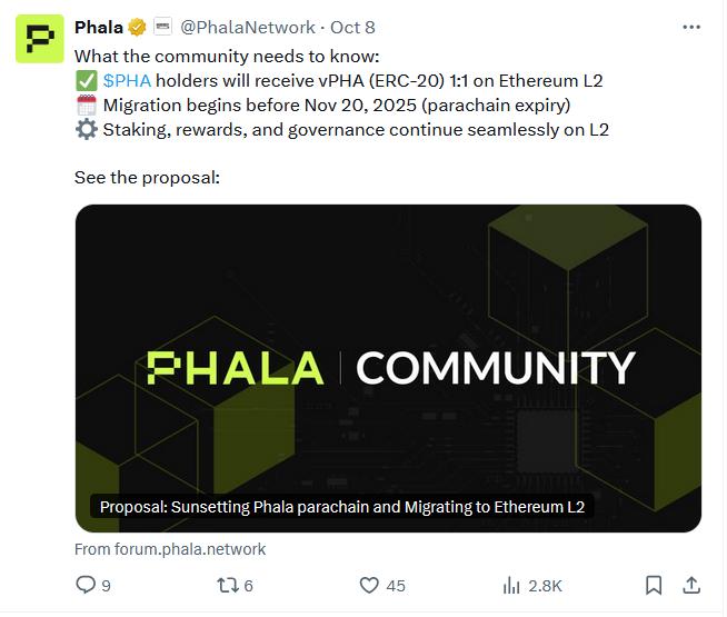 The post adds that Phala (PHA) tokenholders will receive the new ERC-20 variant at a 1:1 ratio, the “migration” will start before Nov. 20, and that “staking, rewards, and governance” will continue seamlessly on the new layer 2 (L2).