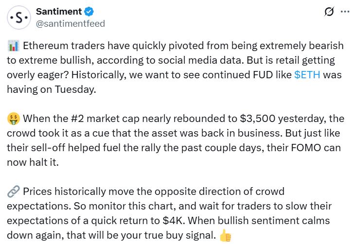 “Ethereum traders have quickly pivoted from being extremely bearish to extreme bullish,” Santiment said, adding that when ETH “nearly rebounded to $3,500 yesterday, the crowd took it as a cue that the asset was back in business.”