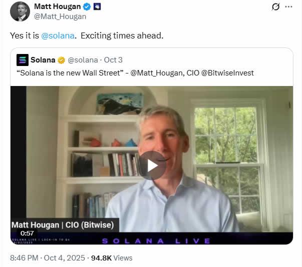 “I think Solana is the new Wall Street,” said Hougan, speaking with Solana Foundation’s Akshay BD on Oct. 2. He added that the Wall Street audiences consider Bitcoin (BTC) “very ephemeral” and “hard to get their heads around.”
