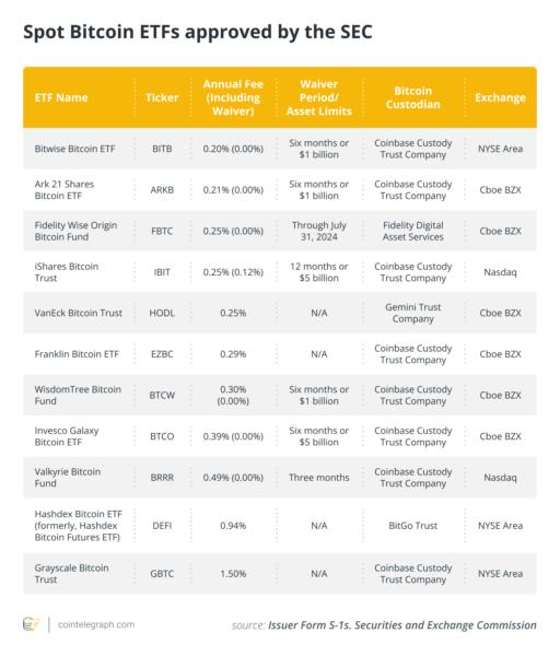 The SEC approved spot Bitcoin ETFs on Jan. 10 from major fund managers. The approved ETFs are the Grayscale Bitcoin Trust (GBTC), BlackRock’s iShares Bitcoin Trust (IBIT), the Bitwise Bitcoin ETF (BITB), Fidelity’s Wise Origin Bitcoin Trust (FBTC), the ARK 21Shares Bitcoin ETF (ARKB), the Invesco Galaxy Bitcoin ETF (BTCO), VanEck’s Bitcoin Trust (HODL), Franklin Templeton’s Franklin Bitcoin ETF (EZBC), the WisdomTree Bitcoin Fund (BTCW), the Hashdex Bitcoin ETF DEFI and the Valkyrie Bitcoin Fund (BRRR).