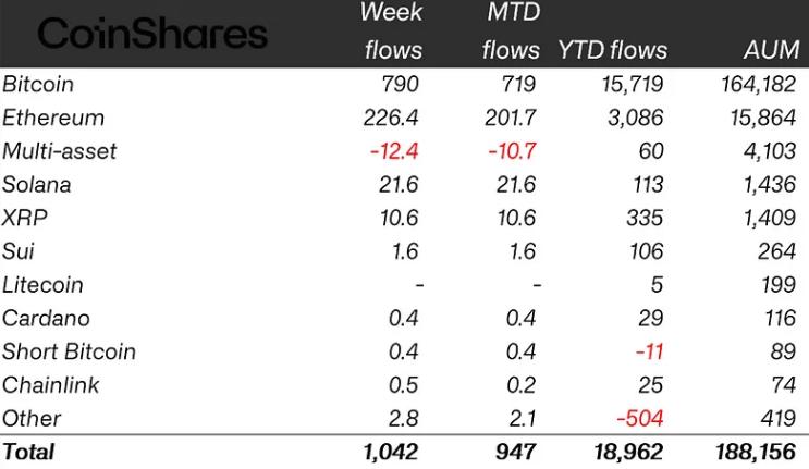 Global crypto exchange-traded products (ETPs) recorded $1.04 billion of inflows for the trading week ended Friday, CoinShares reported on Monday.