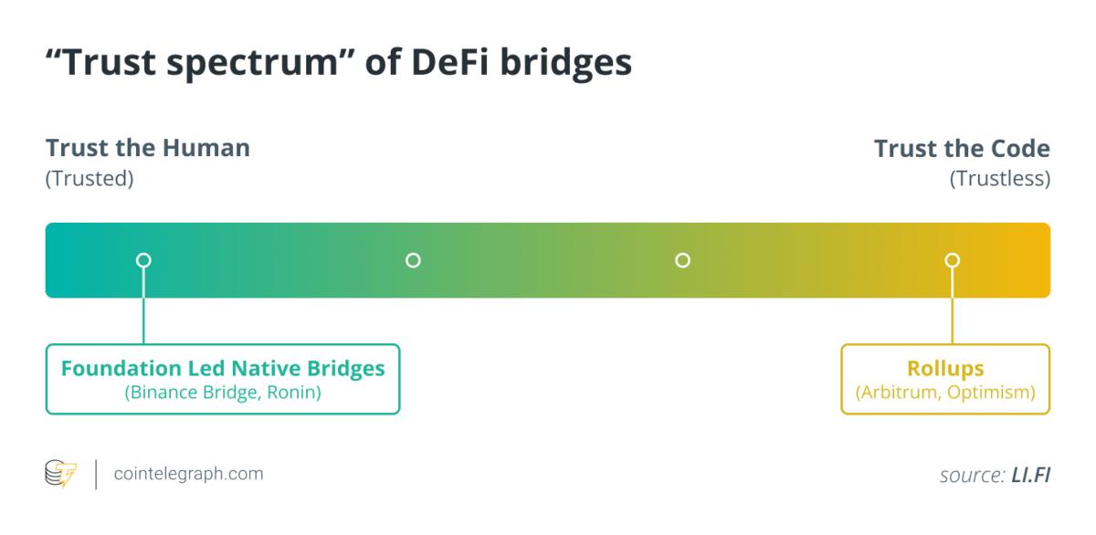 Musighi told Cointelegraph, “I generally consider trustless bridges to be safer than trusted bridges since they operate transparently and rely on a decentralized network to validate and facilitate the transfer of assets between chains, whereas trusted bridges rely on a centralized third party, which means there is a single point of failure and a concentrated attack surface for hackers to target.”