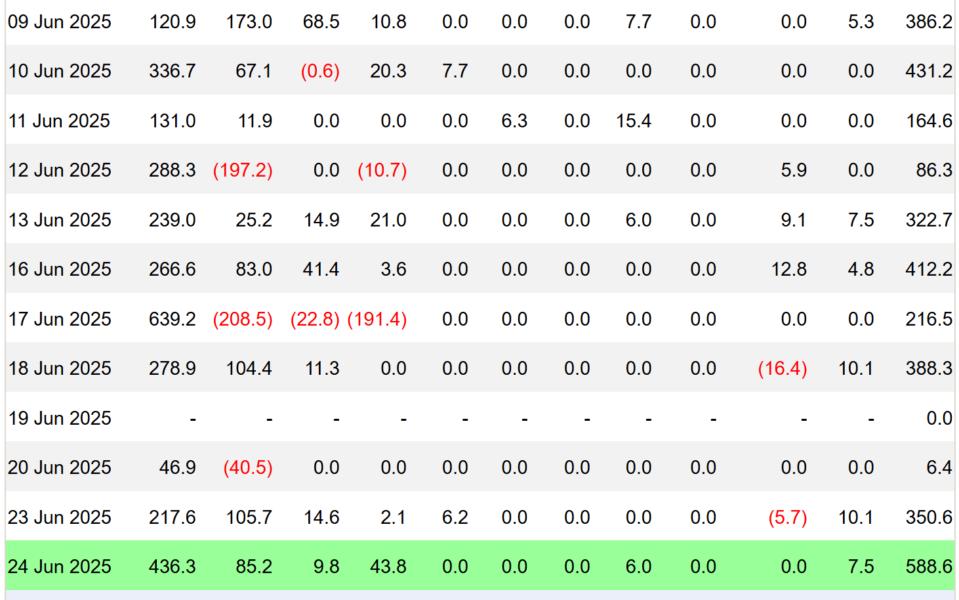 US spot Bitcoin exchange‑traded funds (ETFs) recorded their largest single-day inflow for June on Tuesday with $588.6 million. The surge extends the streak to 11 consecutive days of net positive flows, marking the longest run of consistent inflows since December 2024.