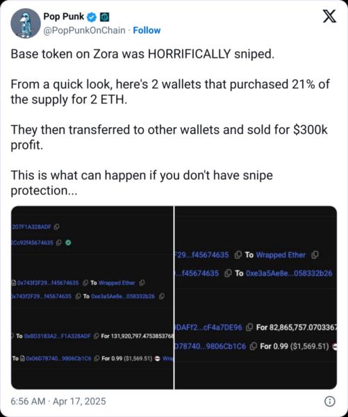 Leggio, who goes by “Pop Punk” on X, said he found two addresses that bought 21% of the token’s supply for 2 Ether (ETH), currently worth about $3,200 before both wallets transferred the tokens to other addresses and sold them for a total profit of around $300,000.