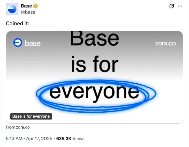 Base posted to X on April 16 with an image promoting the network with its marketing tagline, “Base is for everyone,” it also shared a link to a token of the same name on Zora, a social network where users can make posts into tokens for others to speculate on.