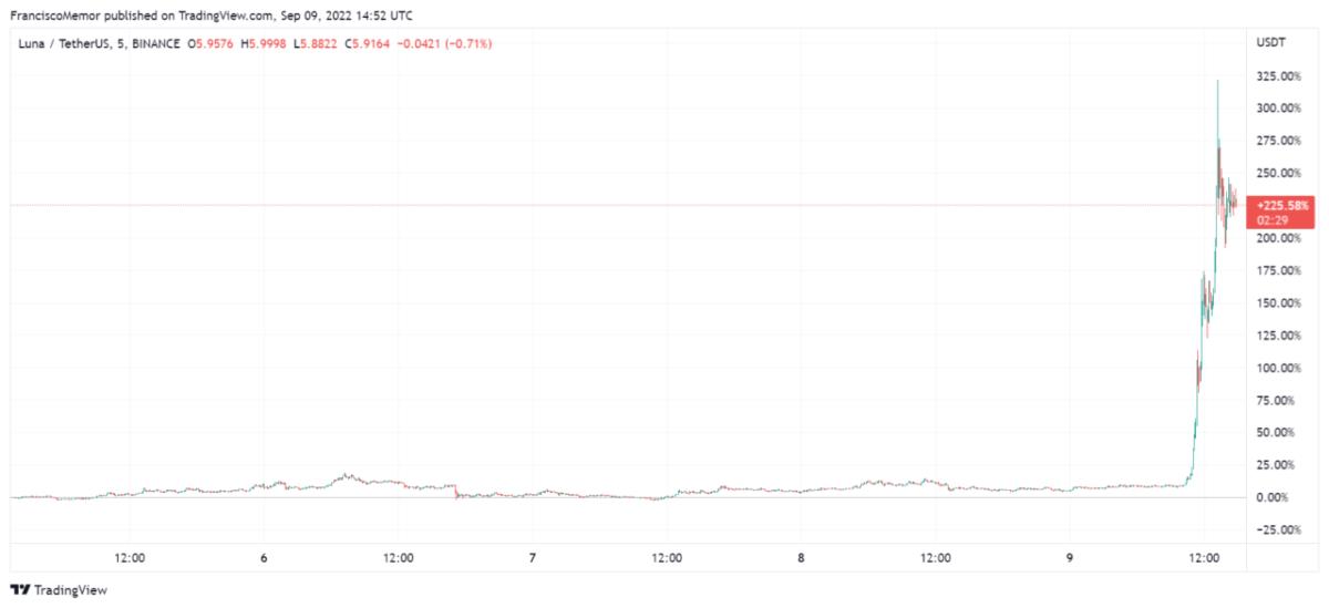 The price of Terra’s $LUNA tokens has mysteriously shot up over the last few hours to now trade above the $5.9 mark, leaving most traders puzzled as to what is going on with the price of the cryptocurrency.