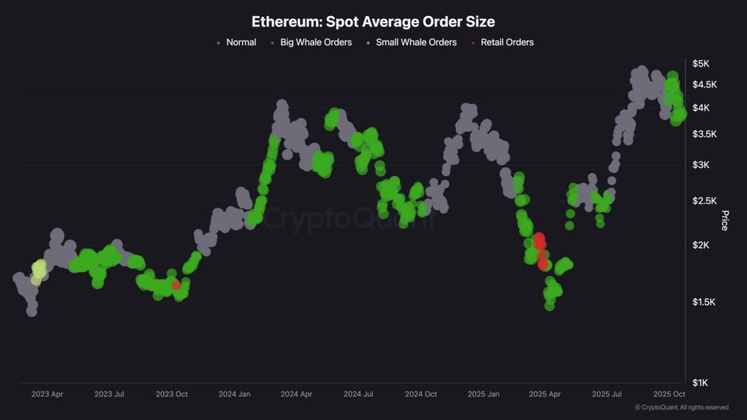 Recent on-chain data points to a renewed tightening in Ethereum’s market structure. Since mid-October, two significant dynamics have emerged simultaneously: exchange reserves have declined sharply, while average spot order sizes have increasingly been dominated by large whale transactions.