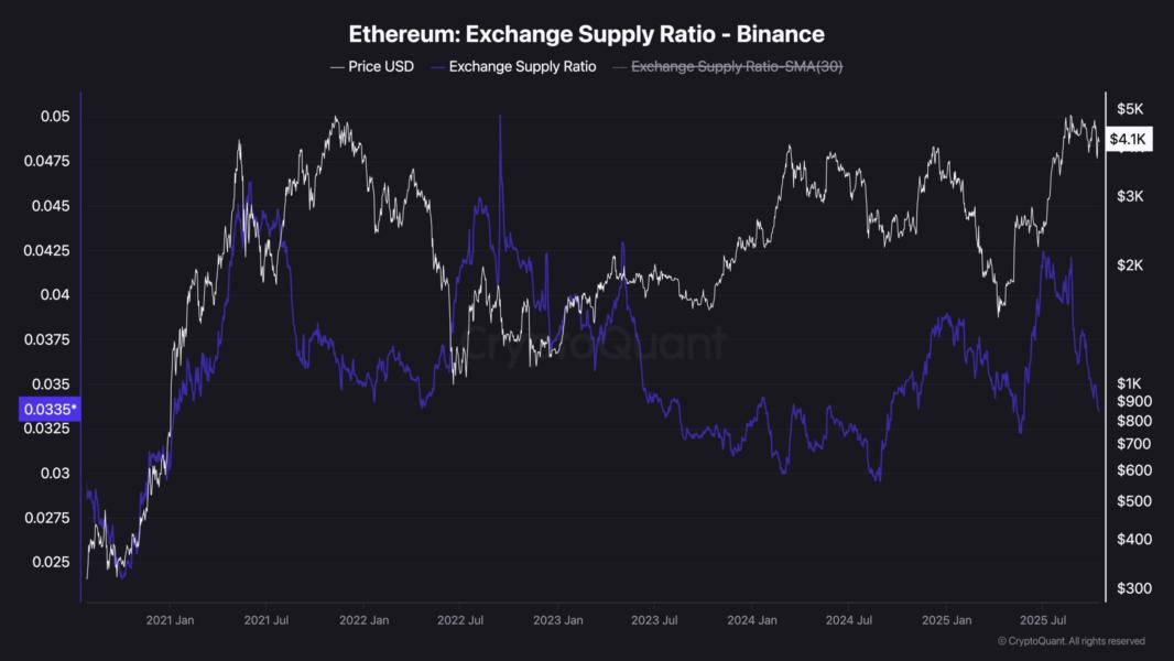 On-chain data from Binance, the largest Ethereum trading platform, shows a sharp decline in ETH’s exchange supply ratio, which has fallen to 0.33, approaching its lowest levels since May. This drop follows a brief uptick in exchange balances during the period when Ethereum was stabilizing around $4K.