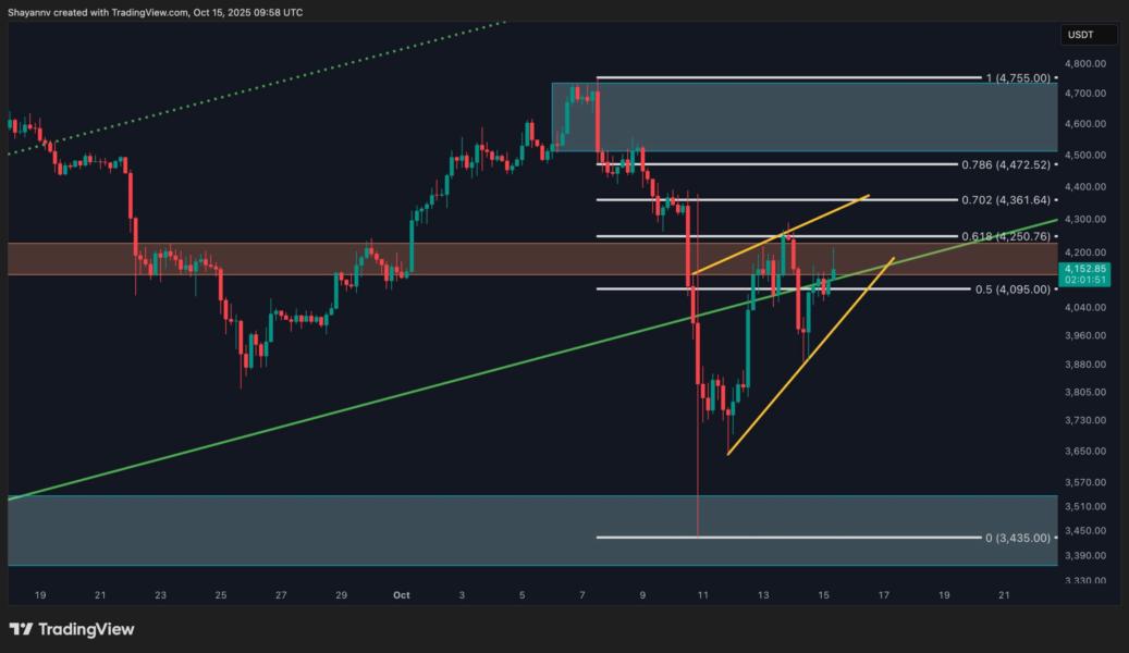 The price action has since reclaimed the channel’s lower boundary, now acting as dynamic support, and is consolidating above this reclaimed level. However, the structure remains fragile. Sustained acceptance above $4.3K is essential to reestablish a bullish bias and open the path toward the $4.6K–$4.7K supply zone. Conversely, a drop back below $4K could invalidate the recovery and expose the $3.6K–$3.4K liquidity pool for another test.