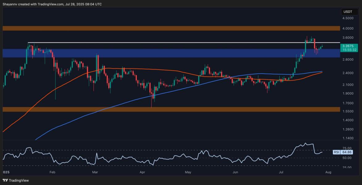If this level holds, it could provide a solid foundation for the next leg up. However, a break below $3.00 could trigger a more pronounced decline toward the $2.40 region, where the aforementioned moving averages converge.
