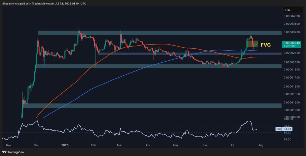 The XRP/BTC chart reflects a similar trend, with Ripple’s token surging from early July and breaking above the 100-day and 200-day moving averages, both positioned near the 2,400 SAT level. This bullish move was met with resistance at 3,200 SAT, where the rally temporarily stalled.