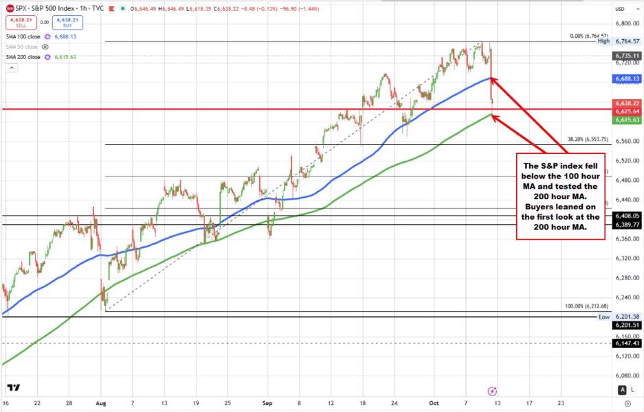 The S&P 500 has also slipped under its 100-hour moving average and tested its 200-hour MA at 6,615.60. Today’s low of 6,618.12 came within striking distance of that support. A clear break below the 200-hour MAs on both indices would shift momentum further bearish and open the door to deeper corrective pressure.