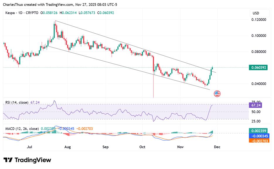 Kaspa has finally broken above the channel’s upper trendline, signaling a potential trend reversal.