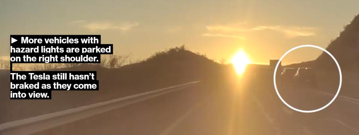The car failed to react to stopped vehicles and sun glare. Footage obtained by the Tesla vehicle was used by Bloomberg to demonstrate the incident.