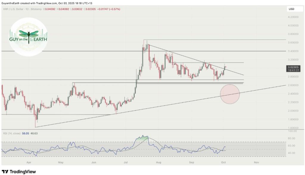 Technical analysis of XRP’s daily candlestick timeframe chart, which was posted on the social media platform X by a crypto analyst called Guy on the Earth, shows that XRP’s price action in the past 48 hours is pushing above a downtrend resistance, with the top of its consolidation rectangle at $3.12 now in focus.
