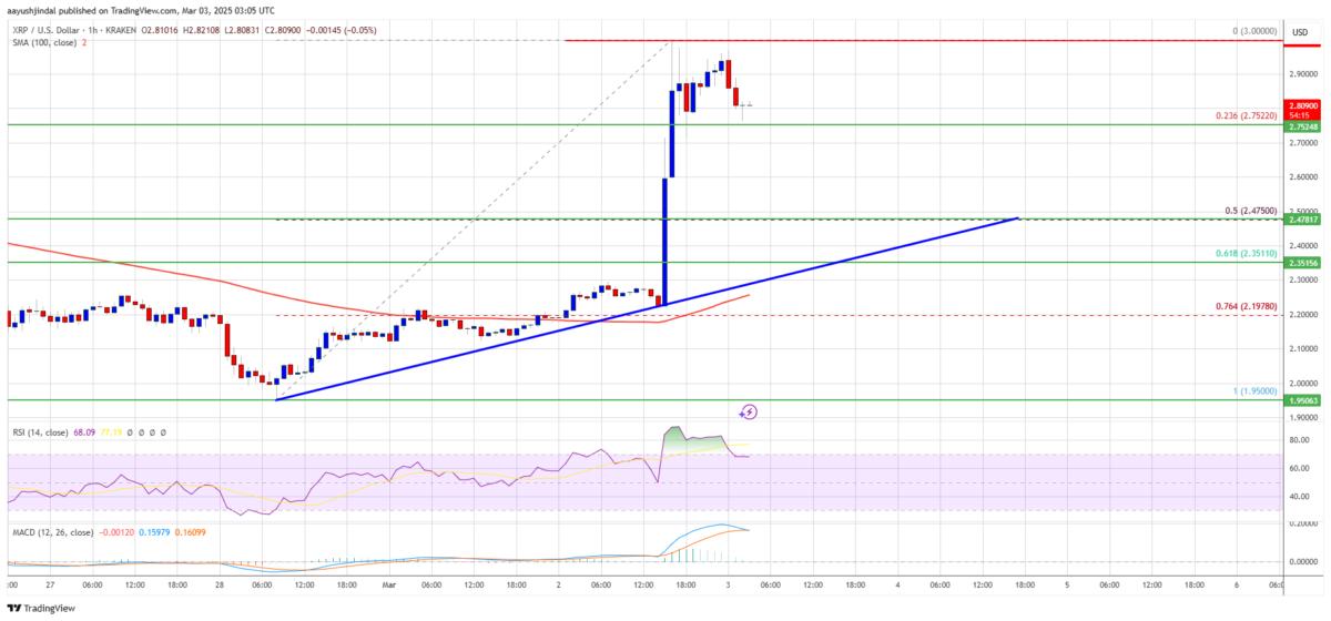 XRP price started a fresh increase above the $2.50 resistance. The price is up over 30% and now faces resistance near the $3.00 barrier.