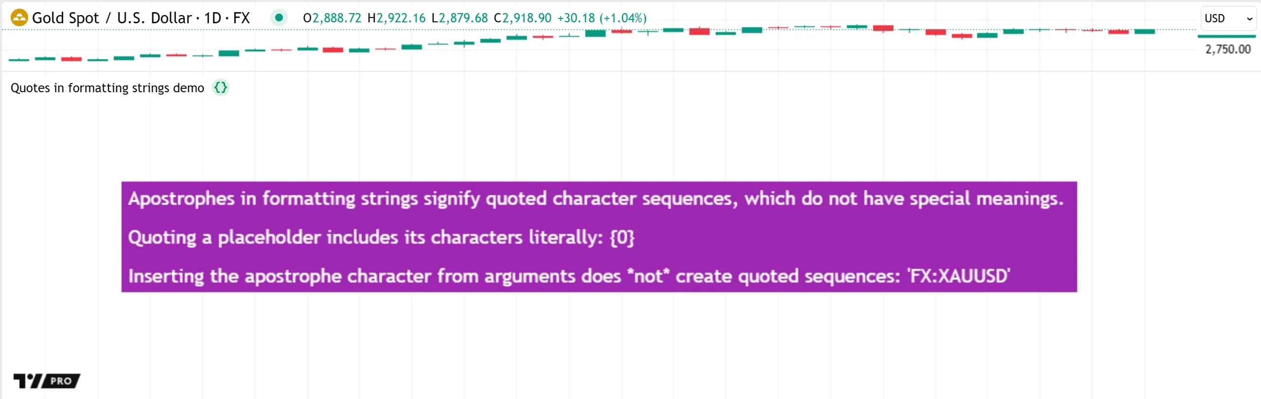 The example below demonstrates how using apostrophes directly in formatting strings differs from inserting them via placeholders. The script uses the ' character directly in the str.format() call’s formatString to define a quoted sequence, and it uses the {1} placeholder to insert the character from an extra argument without creating a quoted sequence. The script displays the resulting formattedString value in a single-cell table on the first bar: