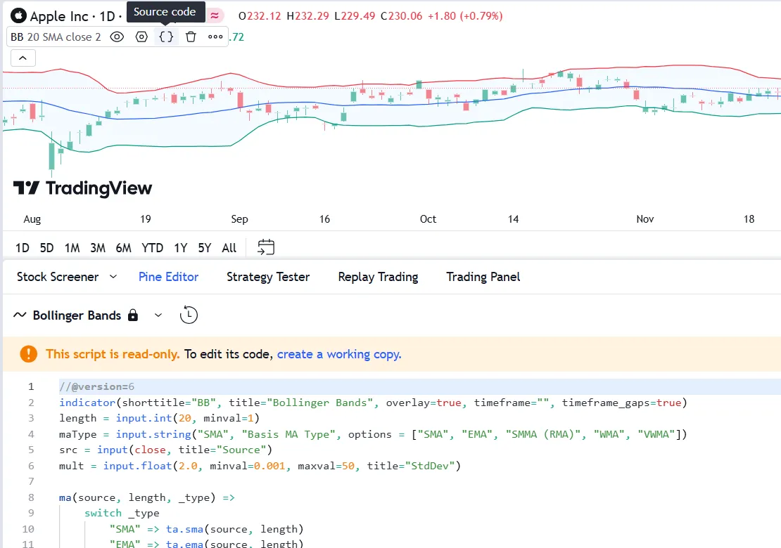For example, this image shows the Pine Editor, where we selected to view the source code from the “Bollinger Bands” indicator on our chart. Initially, the script is read-only, as indicated by the orange warning text: