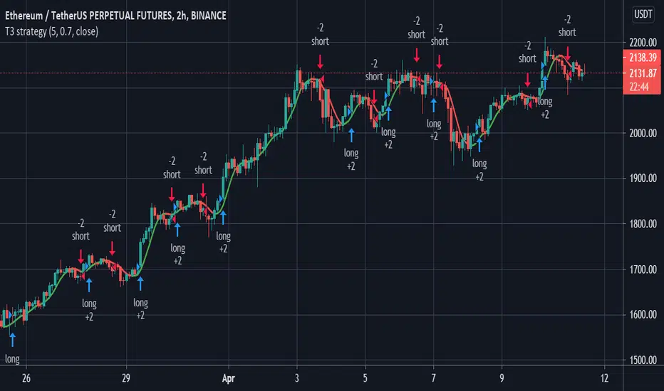 Hereby a simple strategy based on T3 moving average crossover. If people are interested we can also add some alerts in people are interested.