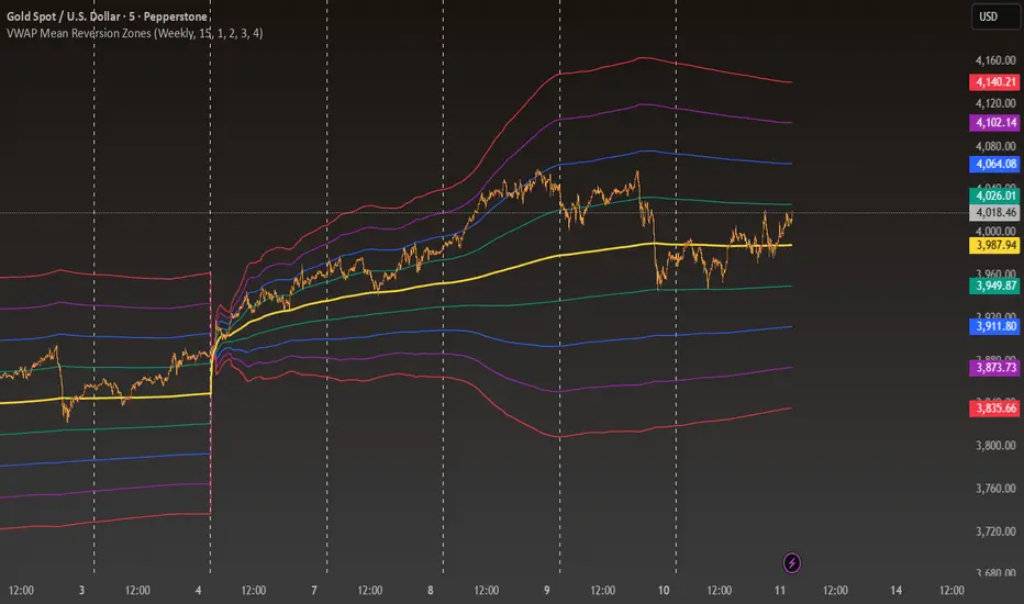 VWAP Mean Reversion Zones is a multi-timeframe VWAP indicator designed to reveal price deviations and volatility structure across higher-timeframe anchors. It calculates a Volume-Weighted Average Price (VWAP) from a user-selectable timeframe (Daily, Weekly, or Monthly) and overlays it directly on your chart.
